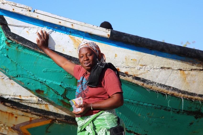 Auch hier sind viele Arbeiter und Fischer aus Senegal. Sie wohnen in kleinen Hütten bei ihren Booten, sehr oft mit der ganzen Familie. Die Frauen versorgen die Fischer und nehmen die Fische aus, Händler kaufen und verkaufen in kleinen Hütten, Schiffsbauer reparieren alte und bauen neue Pirogen, es gibt Träger, Handlanger und Netzflicker. Jeder macht was er kann in der Hoffnung, dass genügend für ihn/sie dabei abfällt. ... weiterlesen...