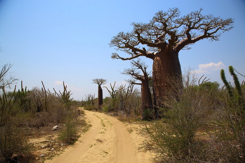 Die Landschaft öffnet sich allmählich. Die kurvige Route windet sich über kleinere Höhenunterschiede hinauf und hinab. Steppengras und Wälder haben endgültig den Hohlweg aus Dornenbüschen und Kakteen abgelöst. Ständig wechselt dunkelroter Sand mit weißem Sand. Die Frauen tragen der Schönheit wegen bzw. als Sonnenschutz Masken im Gesicht. In den kleinen Dörfern am Wegesrand laufen uns die Kinder lachend und singend hinterher. Übrigens, der Zahnstatus der Bevölkerung an der Westküste ist um Klassen besser als an der Ostküste. Sehr häufig blitzen Goldzähne in den lachenden Gesichtern.