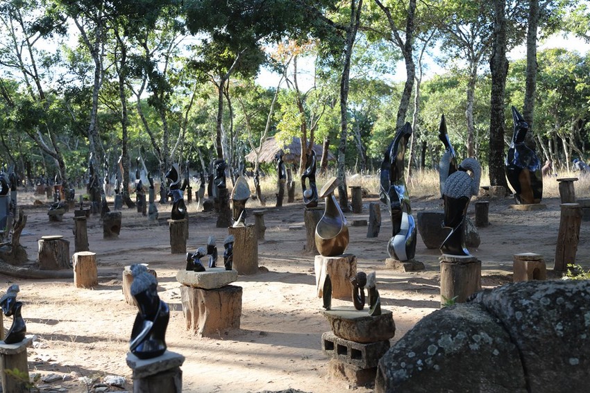 Wir besuchen das Künstlerdorf Tengenge. Bereits 1966 wurde eine ehemalige Tabak-Farm und Chrom Mine von ihrem Besitzer aufgegeben und in dieses Künstlerdorf umgestaltet. Damals kamen die erste Generation Künstler mit ihren Familien hier an. Heute, in der dritten Generation, leben in dem Dorf 550 Personen, das sind 110 Steinmetze mit ihren Familien. Die Künstler kommen von überall aus dem Land, aber auch aus Angola und Mozambique, viele auch ohne ihre Familien. Manche sind hier geboren, Kinder der ersten Generation. Die Gemeinschaft organisiert sich selbst. Das gemietete Land gehört heute einem Künstler, der in Harare lebt. Für Strom und Internet ist kein Geld zur Verfügung, es kommen einfach zu wenige Besucher nach Tengenenge. Zu den Kunden zählen auch einige Galeristen aus München, Neuseeland oder Australien. Auf einem sehr großen Freigelände sind in etwa 5000 Exponate ausgestellt und Chipo und Robert, die zum Manager-Stab der Gemeinschaft gehören, führen uns durch. Wir dürfen alles in Ruhe besichtigen und bekommen Vieles rund um das Gestein und die Arbeit erklärt, während wir den Steinmetzen bei der Arbeit über die Schulter schauen können. Jeder hat einen anderen Stil. Und, wir werden sogar fündig.