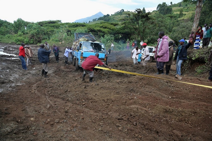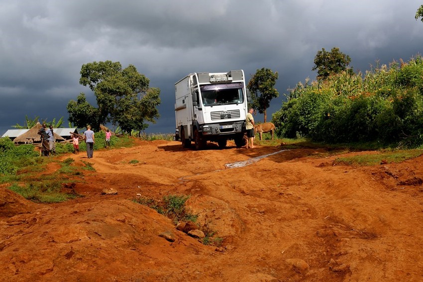 Da waren auch die Situationen, in denen wir uns geschworen haben, nie mehr so kleine, enge Straßen zu fahren. So zum Beispiel am Lake Bunyoni in Uganda, wo die Straße drohte wegzubrechen und wir beinahe in den See gerutscht wären, oder auf der kleinen Schlammstraße rund um den Kilimandjaro in Tansania, wo wir gerade mal so Platz hatten. Und manchmal blieb uns fast das Herz stehen, so in Uganda als wir auf matschiger Straße bergab in den Straßengraben rutschten, oder als wir im Oman mit dem Hinterrad bis zur Achse in eine Abwassergrube einbrachen. Auch unsere Kettensäge war schon mehrmals im Einsatz, um uns den Weg frei zu machen. Reifenwechseln „schockt“ uns mittlerweile nicht mehr, auch wenn wir es nicht allzu gerne machen.